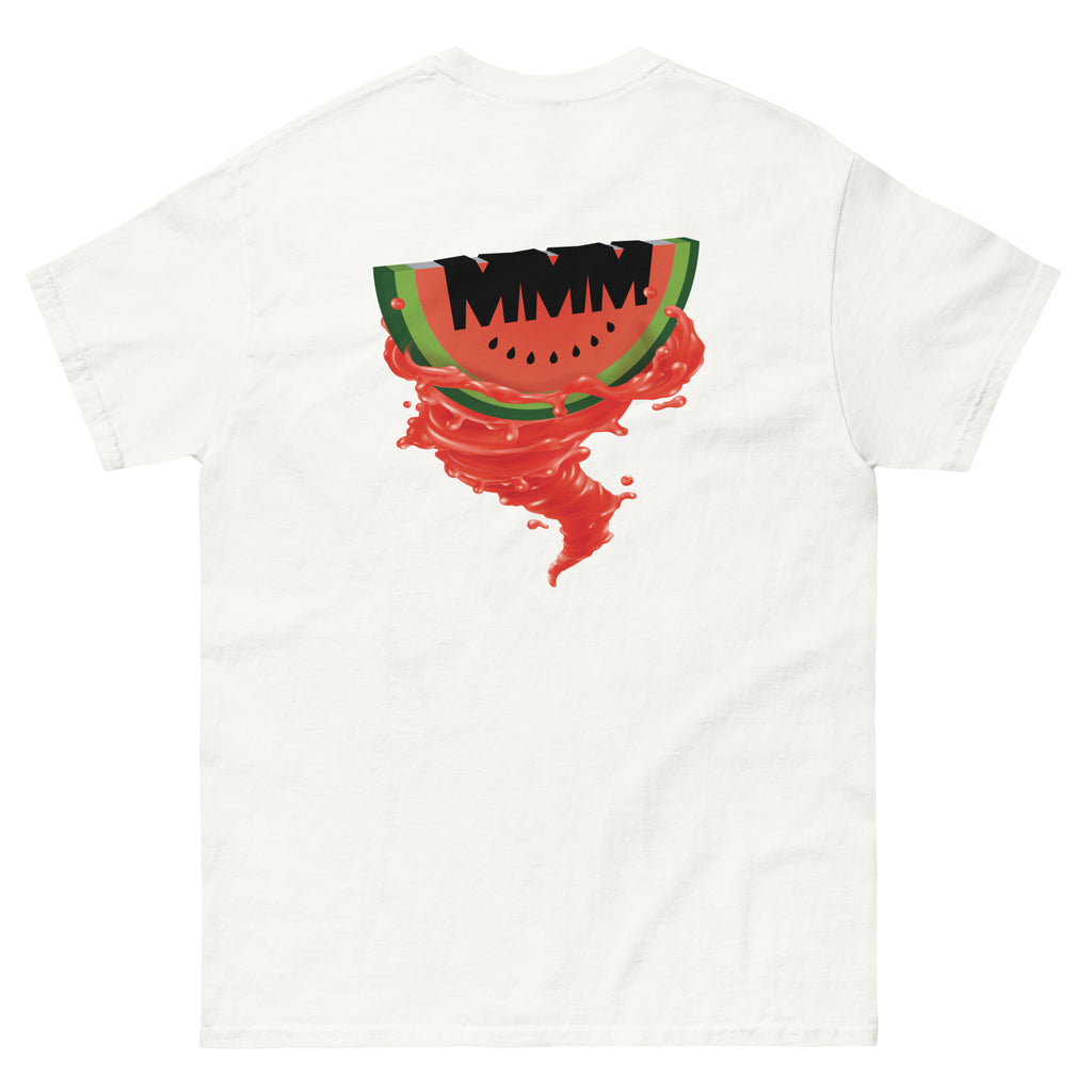 Small MMM Watermelon Refined logo on the front, tornado melon graphic hits the back